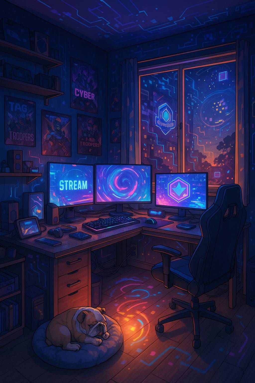 À ses pieds, Billy, son bulldog au pelage noir bringé, ronflait paisiblement, habitué au vacarme virtuel qui emplissait quotidiennement la chambre. Une tache blanche ornait sa poitrine, se soulevant doucement au rythme de sa respiration.