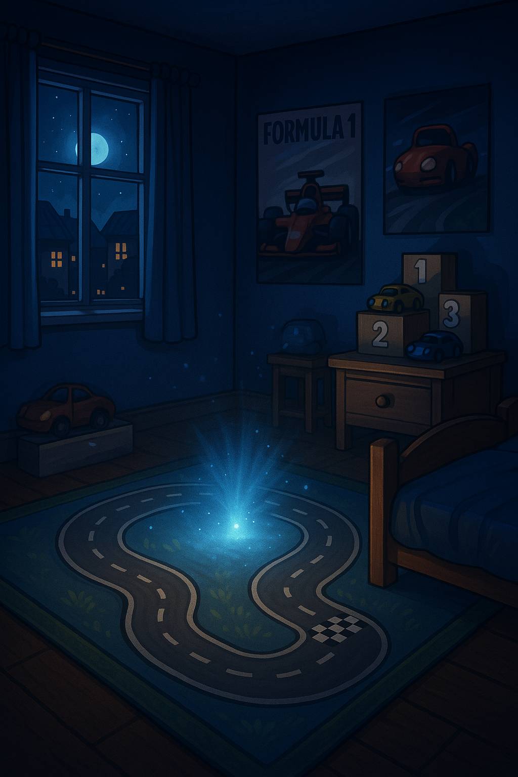 La chambre de Masséo ressemblait à un mini-circuit automobile. Des posters de pilotes célèbres tapissaient les murs bleus. Une collection de petites voitures de course s’alignait sur une étagère en forme de podium. Même son tapis représentait une piste avec ses virages serrés et sa ligne d’arrivée.