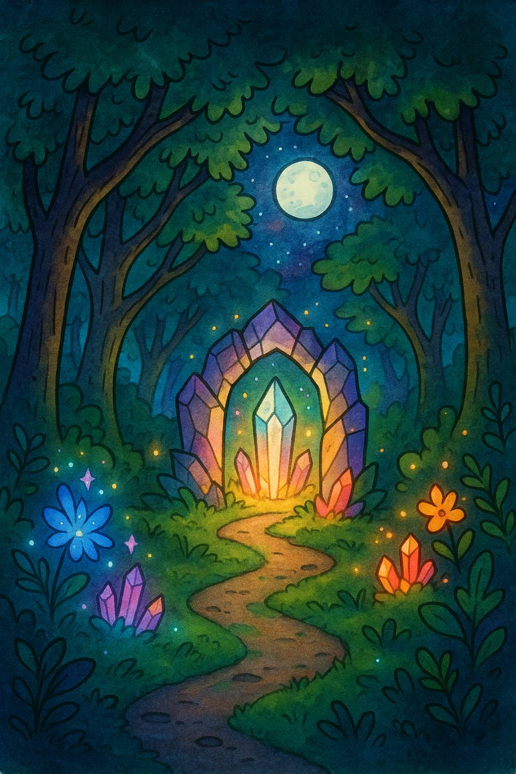 Un bruit soudain la fit sursauter. Sur sa commode, son cahier de dessin venait de s’ouvrir tout seul, révélant une page blanche. Un crayon s’éleva dans les airs et traça rapidement une esquisse: un sentier dans les bois, menant à un portail fait de pierres brillantes.