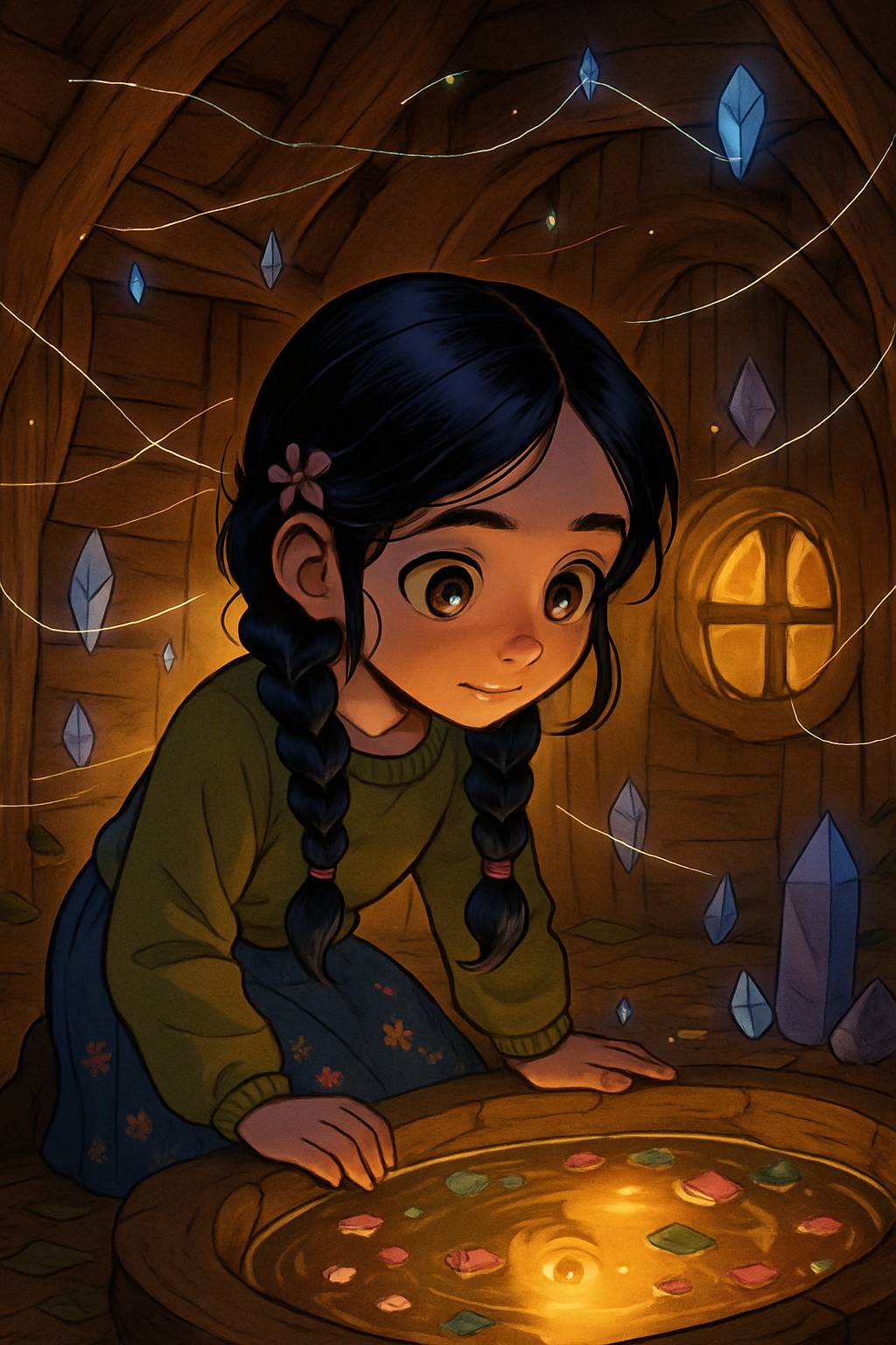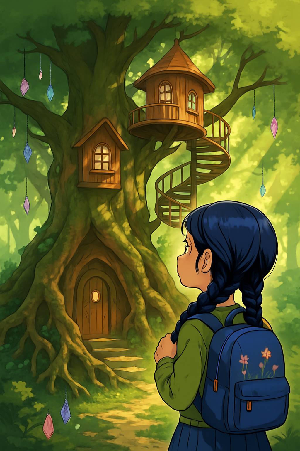 La maison d’Iris se trouvait dans une partie de la forêt que Cylia n’avait jamais explorée auparavant. C’était une cabane étonnante : la moitié était construite dans les racines d’un immense chêne, l’autre moitié s’élevait parmi ses branches. Contrairement au royaume qui se divisait, les deux parties de la maison semblaient parfaitement harmonieuses, reliées par un escalier en spirale qui s’enroulait autour du tronc.