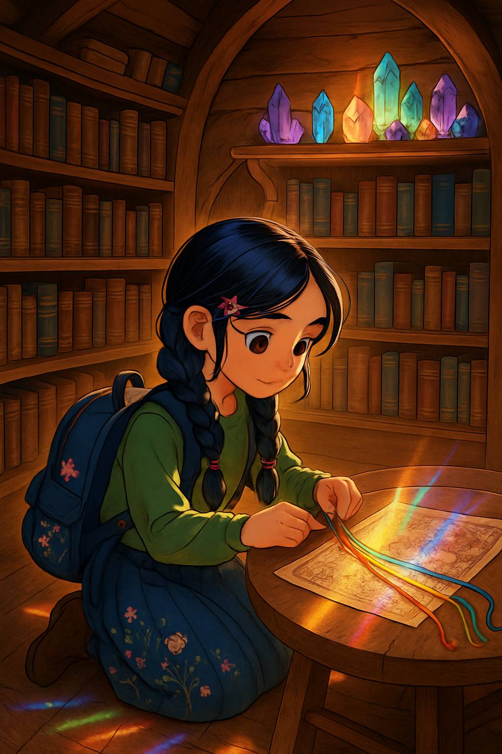 L’intérieur de la cabane était encore plus étonnant que l’extérieur. Des étagères remplies de livres anciens couvraient les murs. Des cristaux de toutes les couleurs pendaient du plafond, projetant des reflets arc-en-ciel sur le sol en bois poli. Au centre se trouvait une table ronde où une carte de la vallée d’Harmonia, beaucoup plus détaillée que celle de Cylia, était étalée.