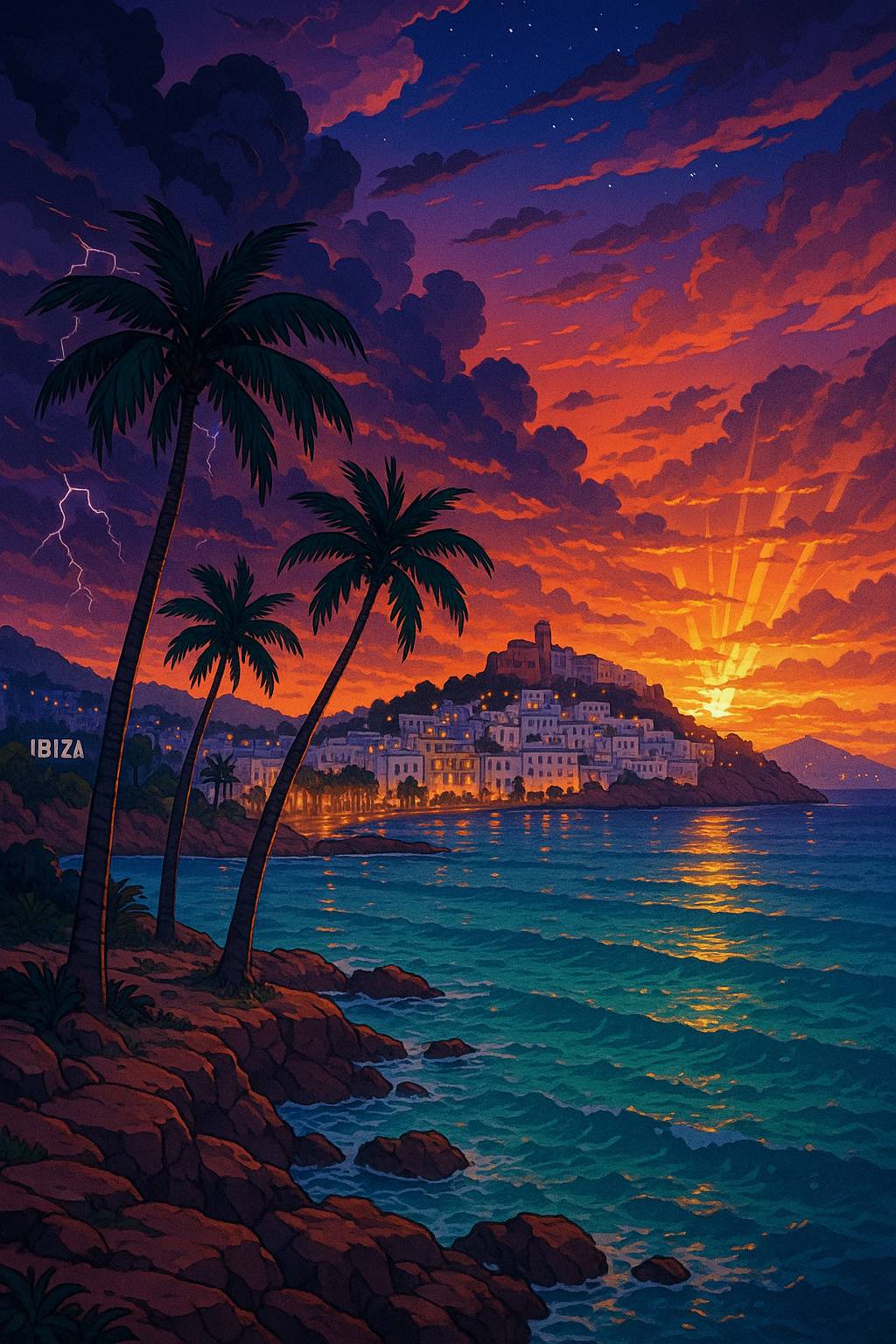 Le soleil se couchait sur Ibiza, teintant le ciel de nuances d’orange et de rose. La mer scintillait comme un miroir liquide, reflétant les derniers rayons du jour qui s’évanouissait.
