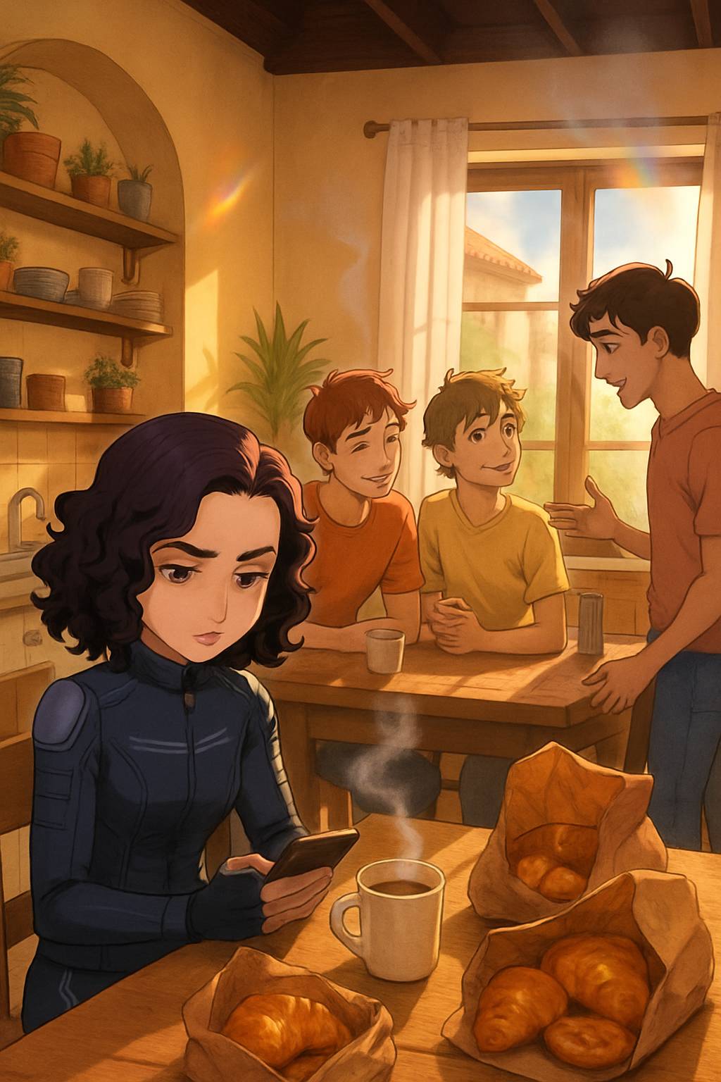 Deux hommes entrèrent dans l’appartement, portant des sacs en papier qui embaumaient l’air de l’odeur de pain frais et de café. Le premier, grand et barbu – celui que Sélina avait aperçu brièvement la veille – devait être Marco. Le second, plus petit avec des cheveux en bataille et des lunettes rondes, était probablement Luis.