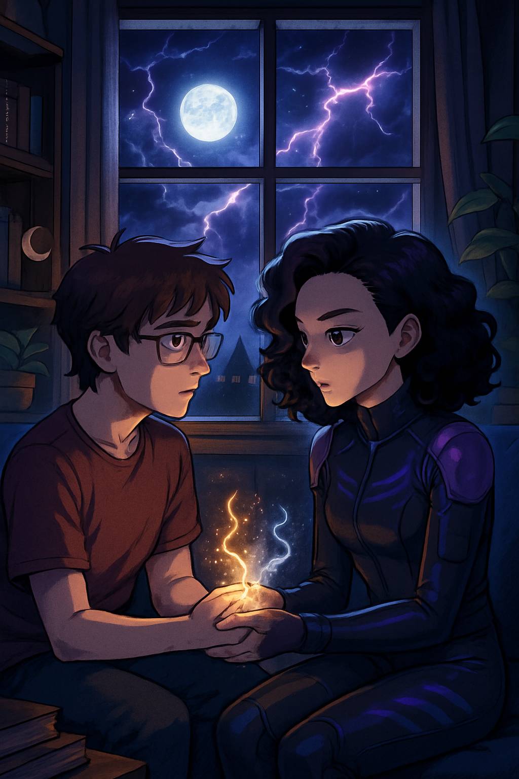 En passant devant le salon, elle aperçut Charly, assise près de la fenêtre, son pendentif en forme de lune brillant doucement dans l’obscurité. Elle semblait perdue dans ses pensées, son visage baigné par la lueur intermittente des éclairs.